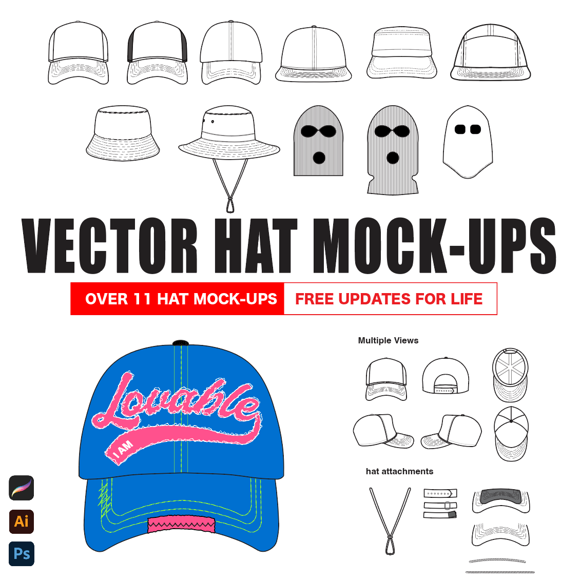 8 Vector hat Mock-ups: snapback, 5-panel, 2 trucker hats, 2 bucket hats, a baseball hat, and a visor. compatible with Adobe Illustrator, Procreate, etc.